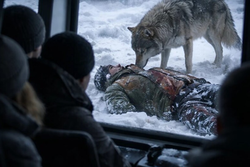 En chock ersatte omedelbart rädslan i bussen. Vargarna hade inte blockerat vägen för att attackera – de hade gjort det för att stoppa bussen, för att den frusne mannen skulle uppmärksammas. En av vargarna, som verkade leda flocken, gick ända fram till mannen under snön och stannade där, som om den sa: “Här är han – rädda honom.”