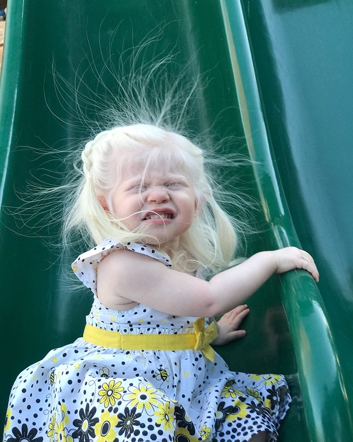 Men bakom det speciella yttre döljer sig en helt vanlig liten flicka: lekfull, nyfiken och full av liv. Hon älskar att leka, umgås med andra barn – och sprider glädje vart hon än går.