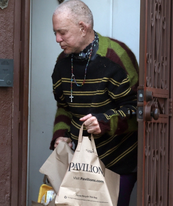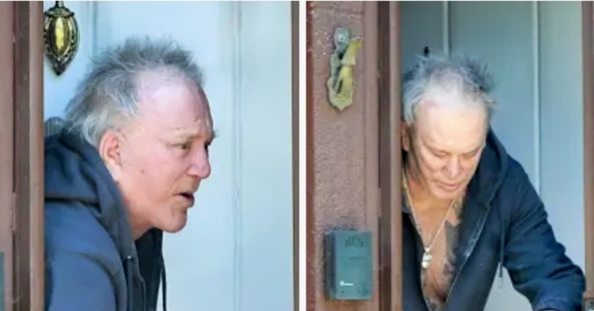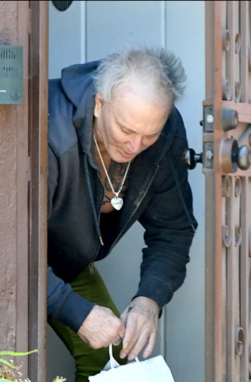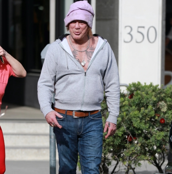 Vid en ovanlig offentlig syn fotograferades 72-årige skådespelaren Mickey Rourke utanför sitt hem i Beverly Hills. Stjärnan från filmer som 9 1/2 Weeks såg märkbart ovårdad ut, iklädd en uppdragen grå hoodie utan tröja, gröna fritidsbyxor och sneakers. Hans toviga grå hår förstärkte det avslappnade intrycket medan han tillbringade ungefär en timme med att tala med en skadedjursbekämpare, enligt bilder som Page Six fått tag på.