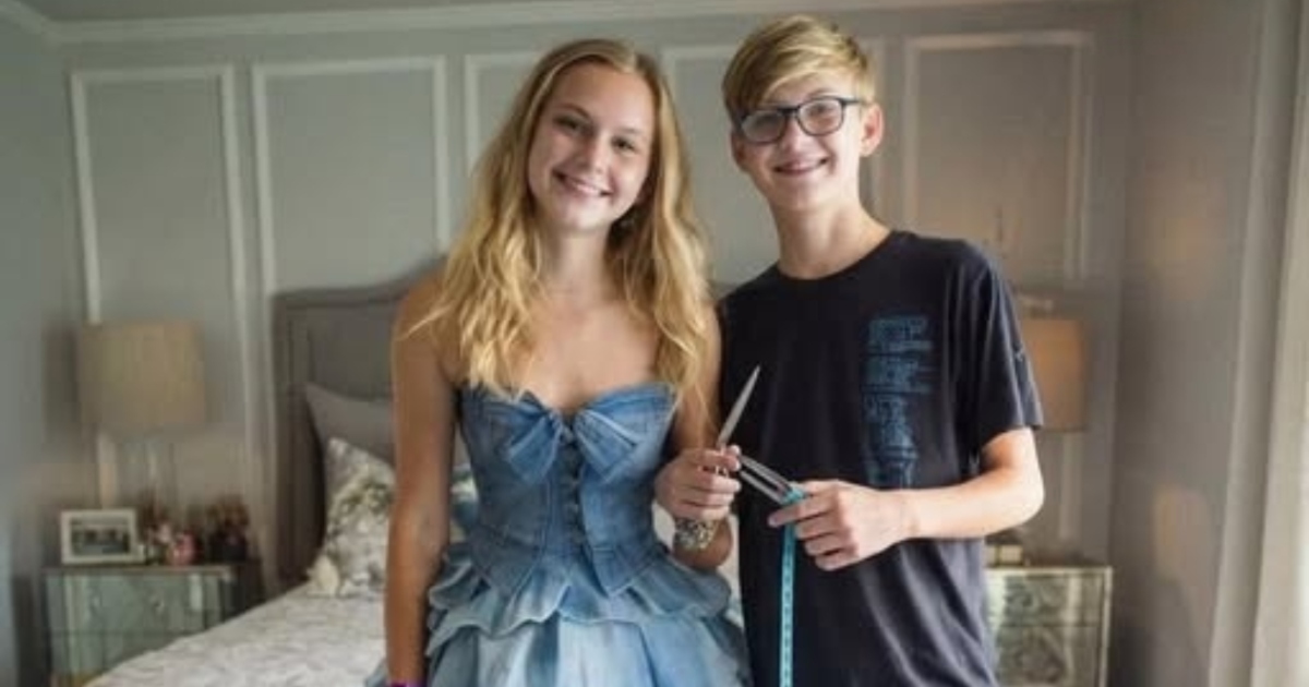 Efter att vår pappa gått bort tog min styvmor Carla kontroll över arvet som vår mamma lämnat efter sig och hävdade själviskt att pengarna behövdes till hushållsräkningar, samtidigt som hon hånade min önskan om en studentklänning. Hon förlöjligade mig, kallade en potentiell klänning för ett “överprissatt prinsesskostym” och sade att ingen ville se mig “strutta omkring”. Nedslagen drog jag mig tillbaka till mitt rum, men min 15-årige bror Noah tog saken i egna händer med en hemlig plan. Han hämtade vår mammas gamla symaskin och en hög av hennes vintage-jeans och spenderade nätterna med att omsorgsfullt skapa en skräddarsydd klänning som kändes vävd av vår mammas ande.