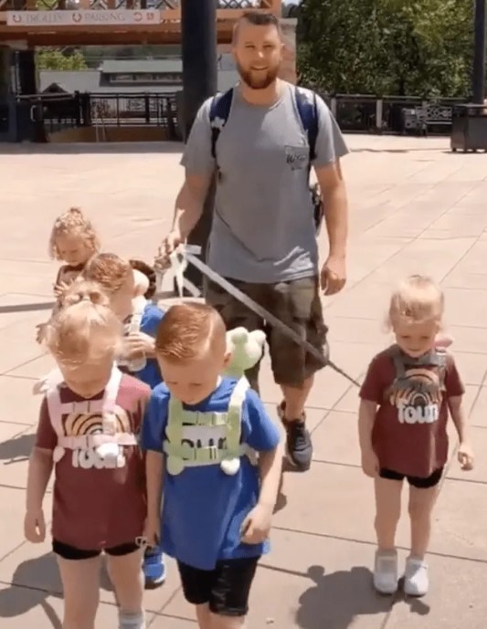 Att hålla reda på fem små barn ute bland folk kräver struktur och eftertanke. Paret började med en barnvagn med sex sittplatser, men insåg snart att de behövde något mer lätthanterligt. När de befann sig på mer folktäta platser använde de dessutom barnselar för att garantera barnens säkerhet.