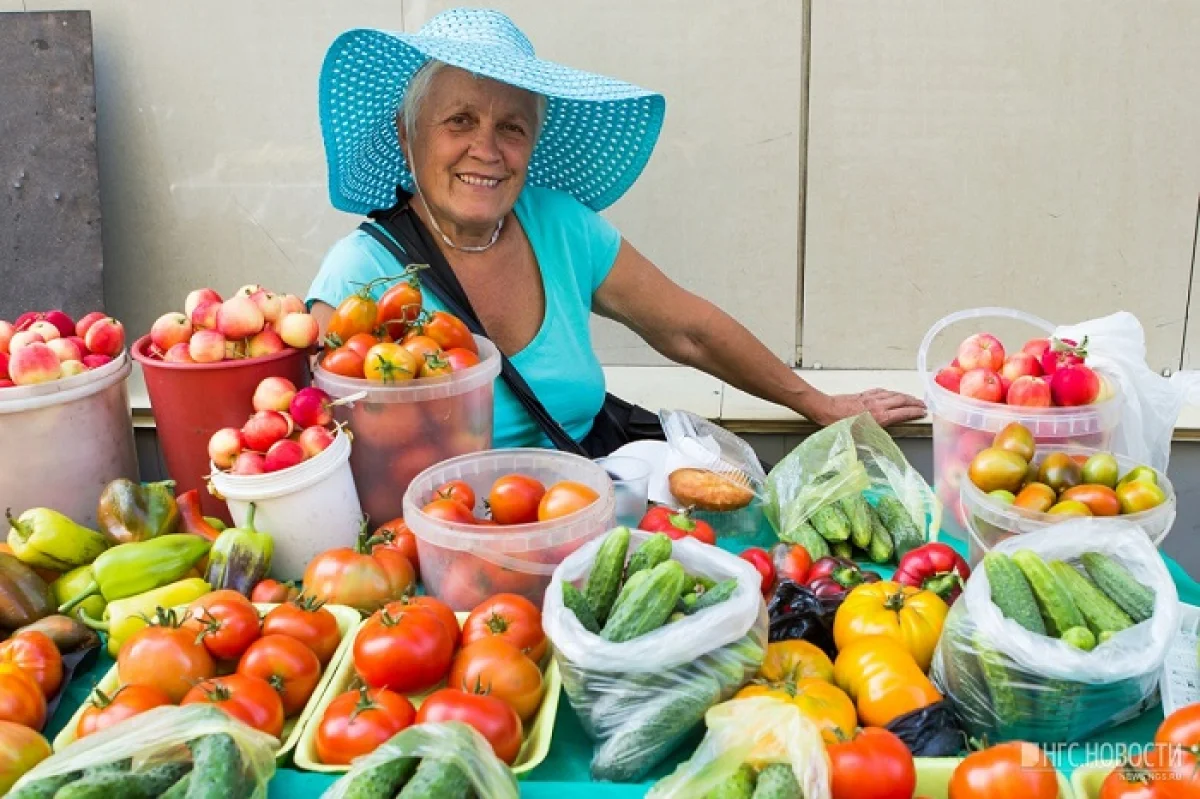 Kvinnan, klädd i en sliten tröja och en urblekt kjol, hade noggrant ordnade tomater, morötter och gurkor.